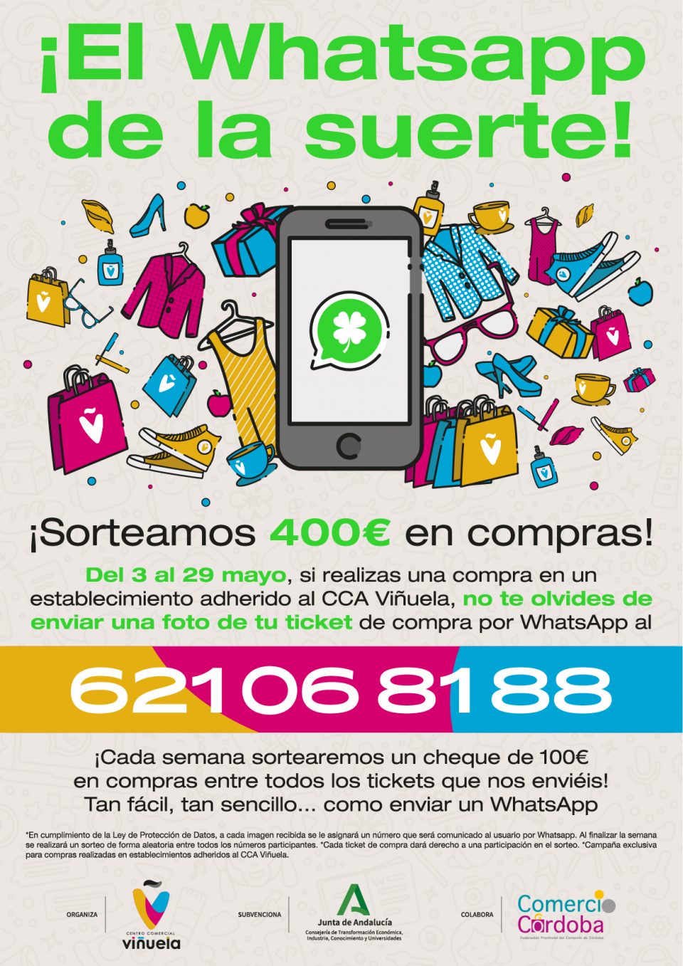 Del 3 al 29 de mayo, todos los clientes que realicen una compra en algún establecimiento adherido al Centro Comercial Abierto Viñuela podrán enviar una fotografía de su ticket de compra por WhatsApp para entrar así en el sorteo de un cheque por valor de 100€ en compras. ¡Sorteamos un cheque cada semana del mes de mayo!